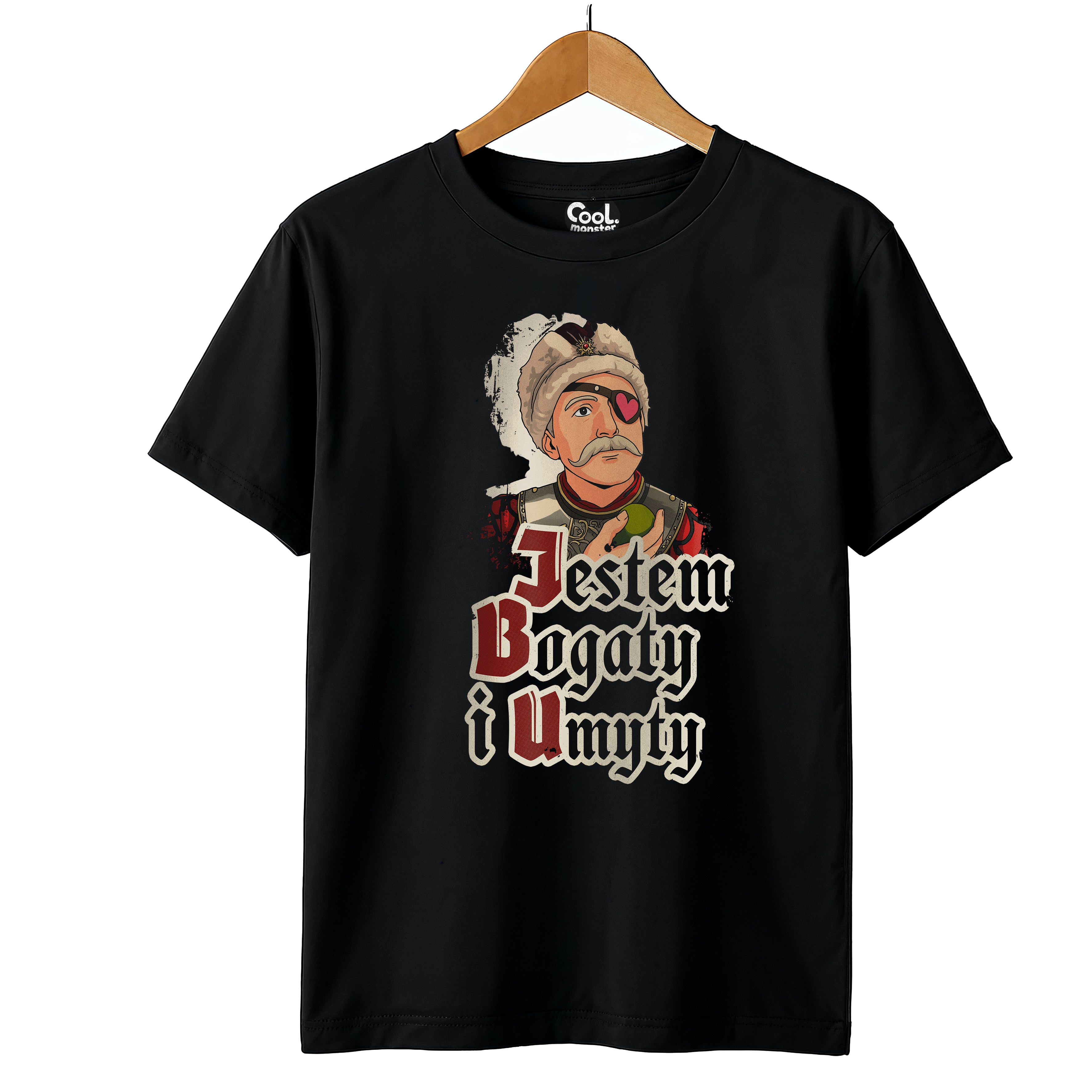 Jeśli też czujesz w sobie ducha sarmaty – ta koszulka jest dla Ciebie! Nadruk z hasłem „Jestem Bogaty i Umyty”, czyli kultowym tekstem, to idealna dawka absurdu, dumy narodowej i szlacheckiego przepychu. Do tego solidna bawełna o gramaturze 190g i czarny kolor, który pasuje do każdej kontuszo-marynarki.