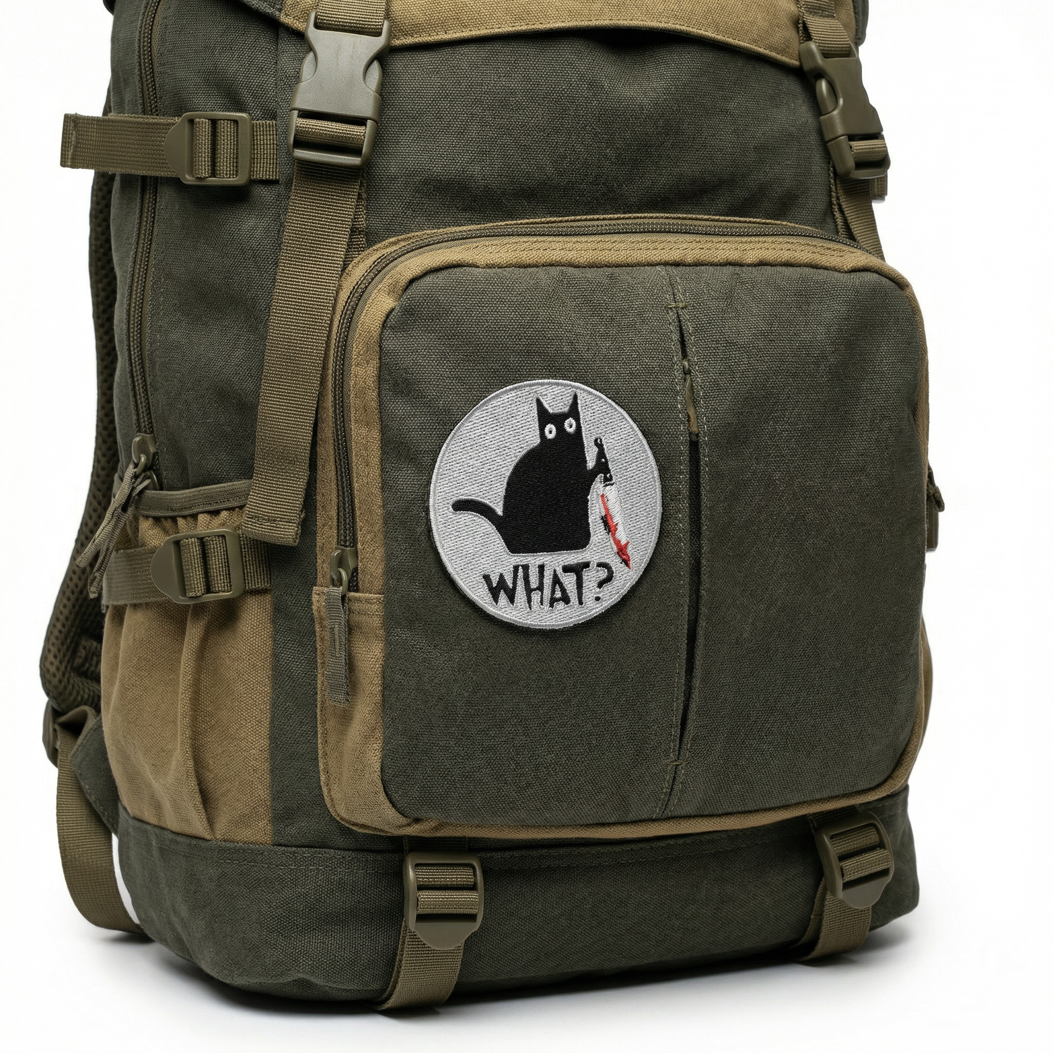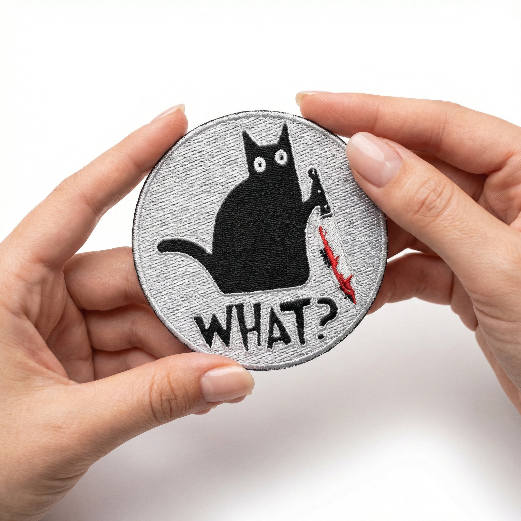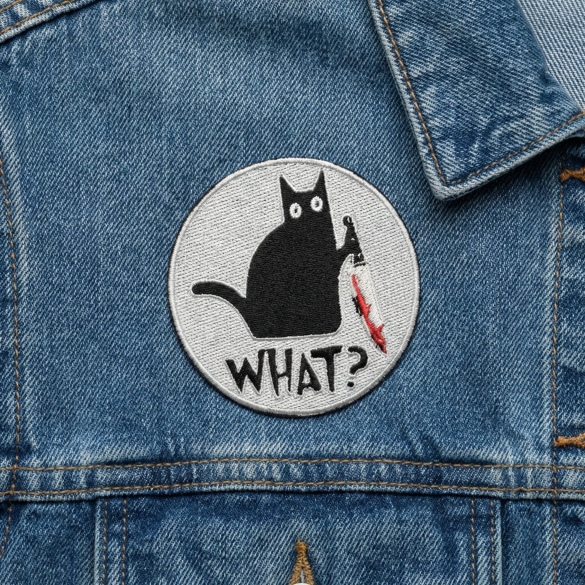 Krótko i na temat: oto haftowana naszywka z kotem, który wygląda dokładnie tak, jak Ty, gdy ktoś mówi coś kompletnie absurdalnego 😼 Kultowy napis WHAT?, solidne wykonanie i produkcja w Polsce – styl i jakość w jednym okręgu o średnicy 9 cm.