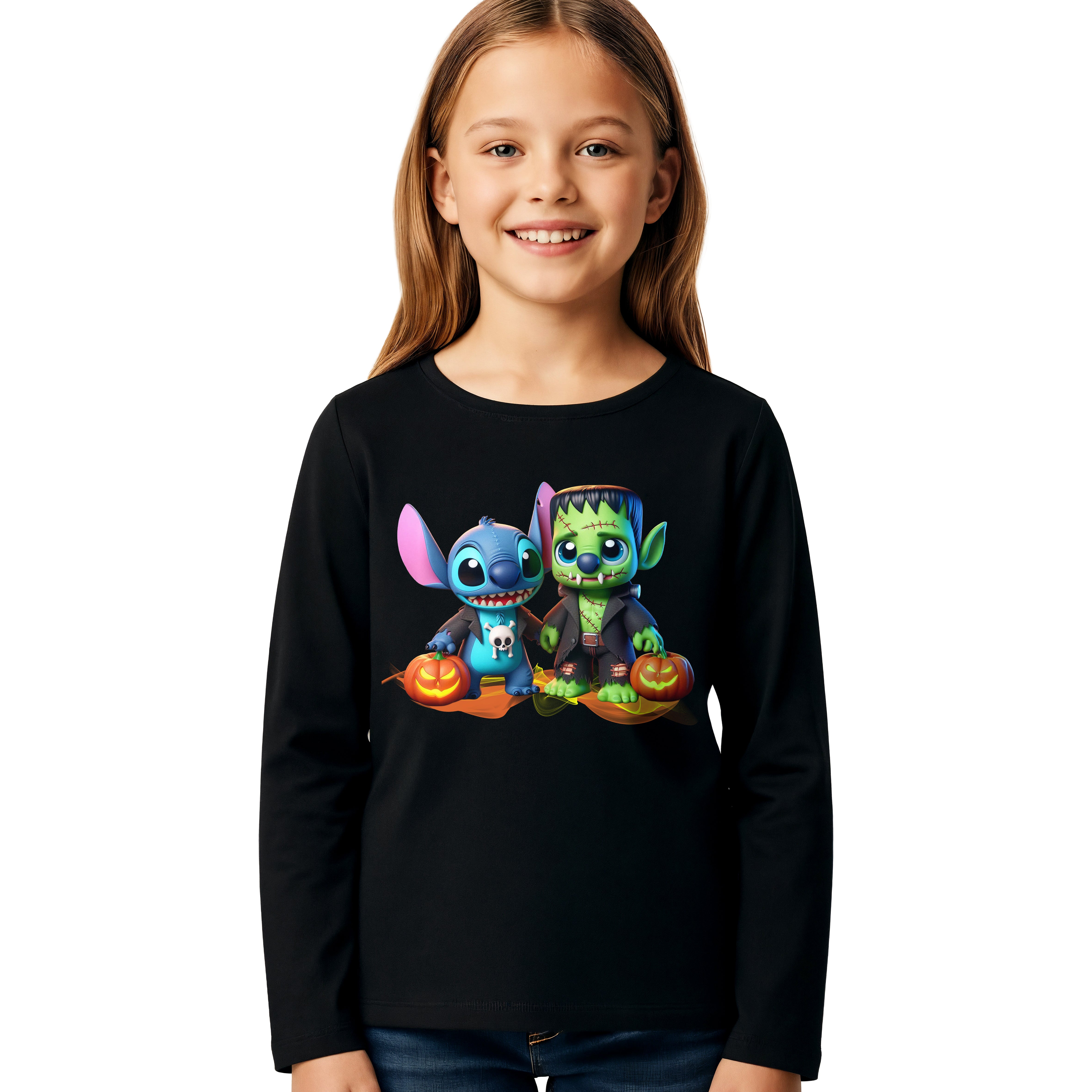 Na froncie bluzki dumnie prężą się uroczy Stitch w halloweenowym wydaniu oraz jego zielony kumpel Frankenstein. Obaj dzierżą dynie jakby właśnie wracali z cukierkowego rajdu "cukierek albo psikus". Ten nadruk to nie tylko dekoracja – to świetlna przygoda!