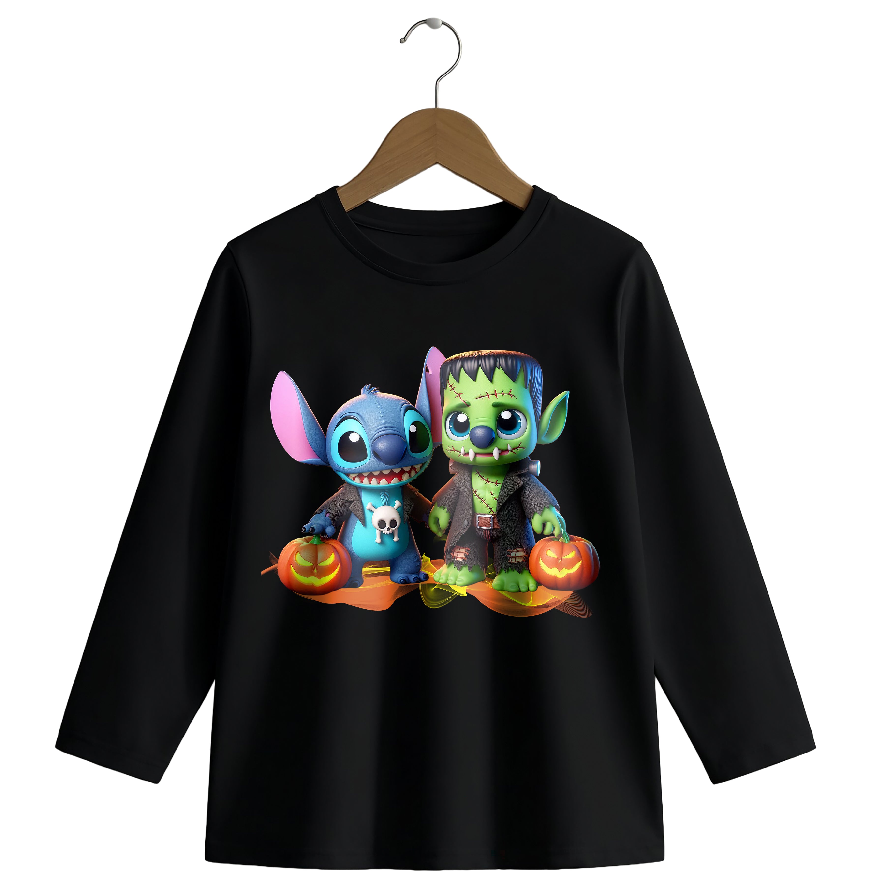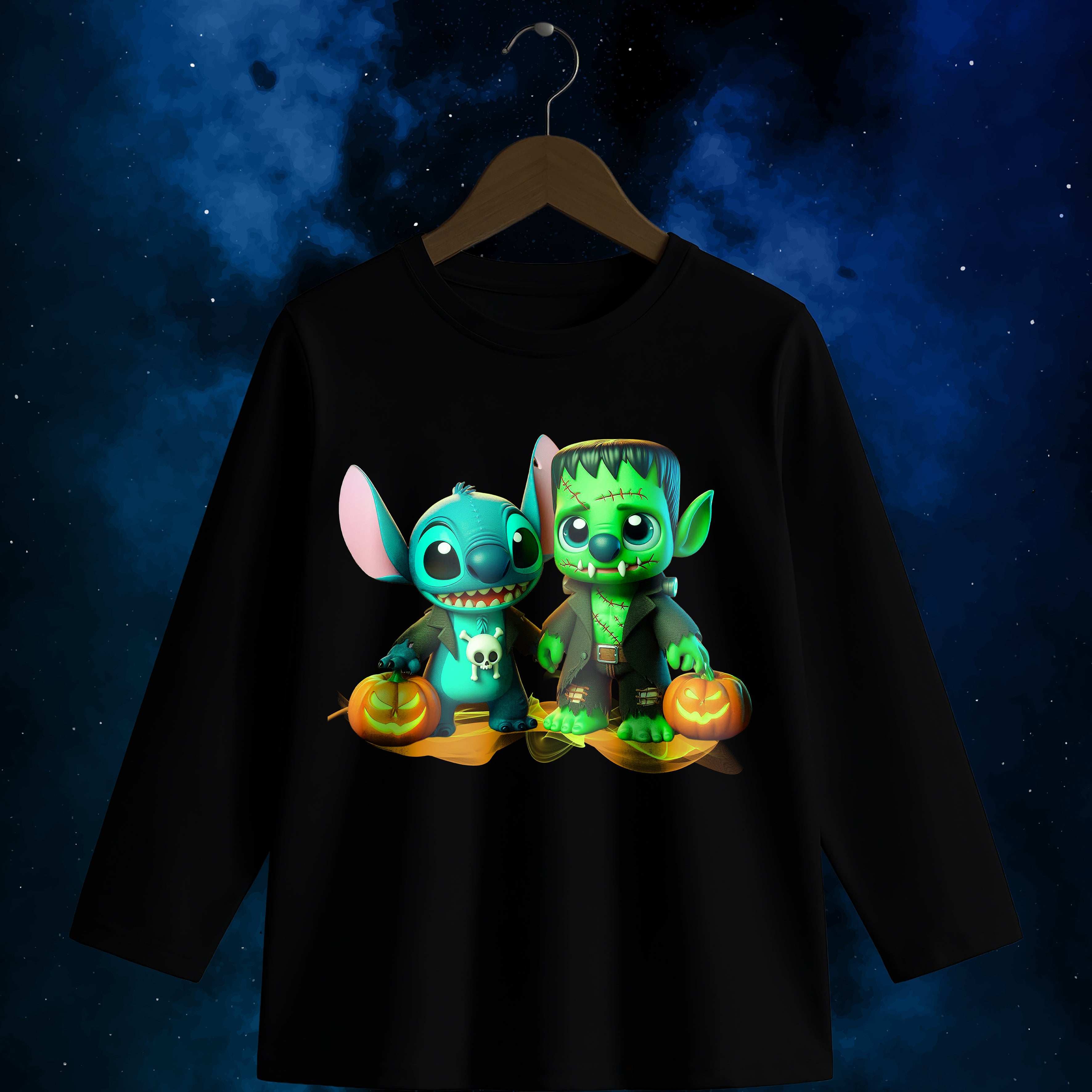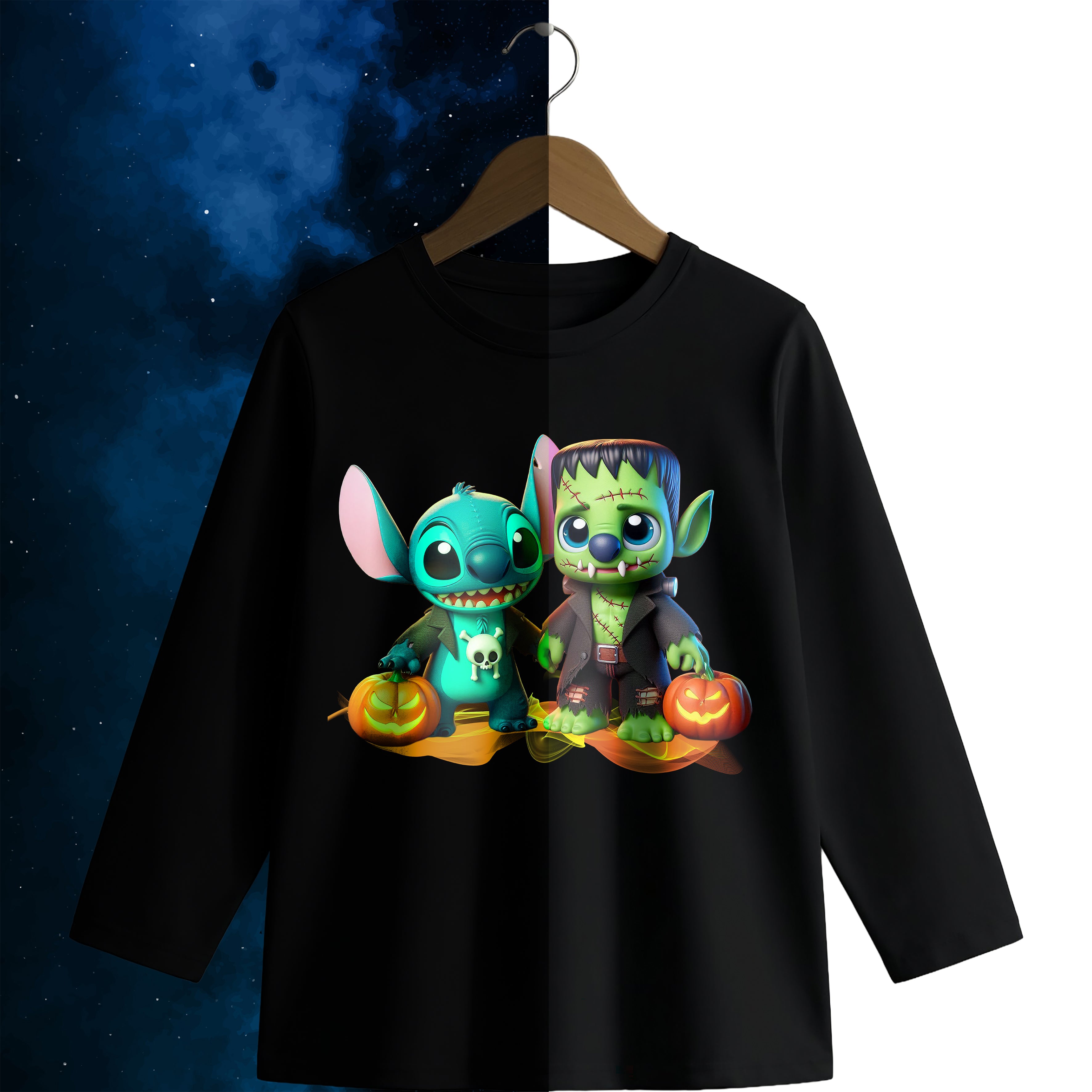 👻✨Uwaga! Nadruk świeci w ciemności!✨👻 Ta bluzka to halloweenowy hit dla dzieciaków, które lubią wyróżniać się nie tylko za dnia, ale i po zmroku! Wykonana w 100% z miękkiej, oddychającej bawełny (gramatura 190g/m²), z bajeranckim nadrukiem Stitcha i jego przyjaciela Frankensteina. Idealna na Halloween, imprezy przebierane, no i oczywiście do świecenia w nocy! 🌙💡