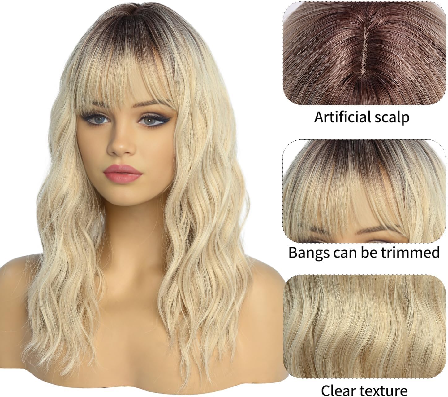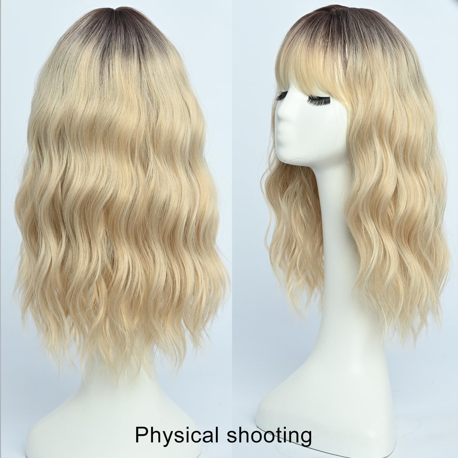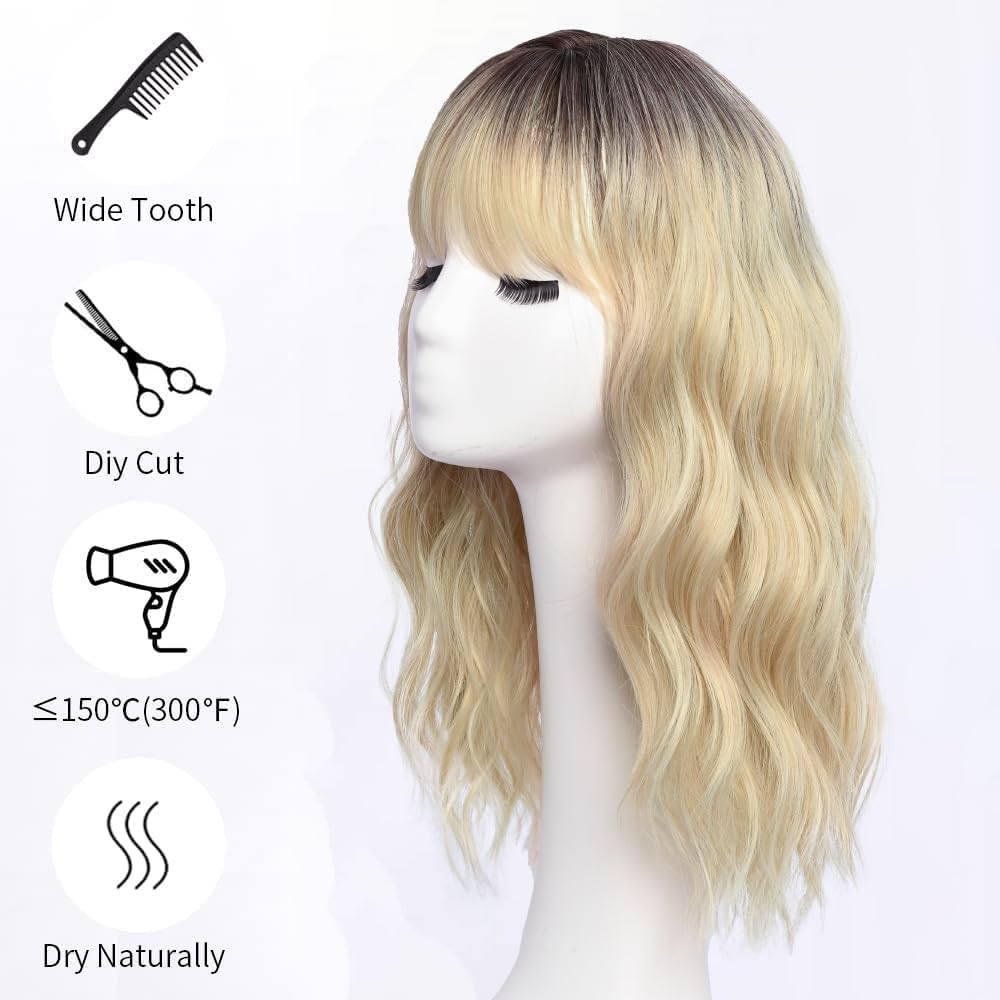 Peruka damska ombre blond fale z grzywką – naturalny wygląd, oddychająca czapeczka