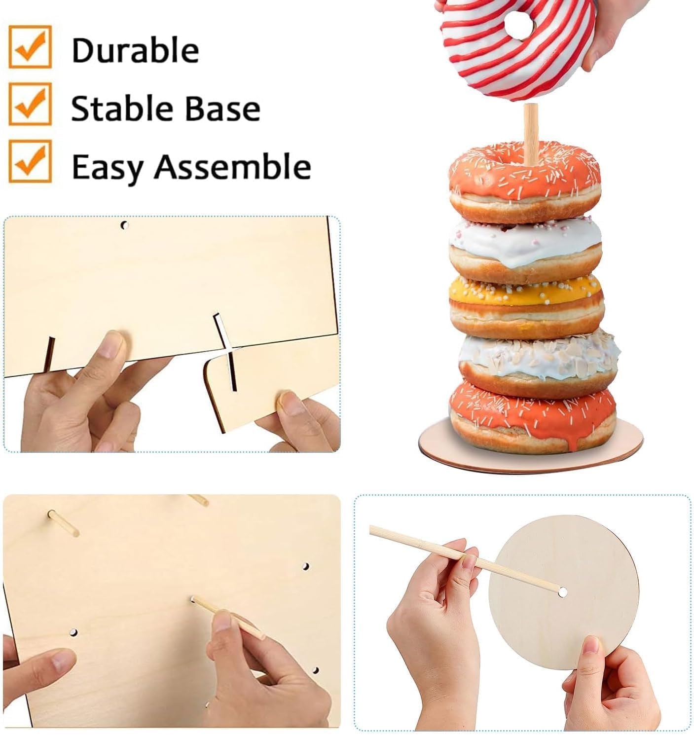 Chcesz, żeby słodki stół wyglądał imponująco? Ten drewniany zestaw 4 stojaków na donuty 2w1 to idealne rozwiązanie! Świetny na wesela, przyjęcia, urodziny czy baby shower — każda sztuka robi wrażenie!