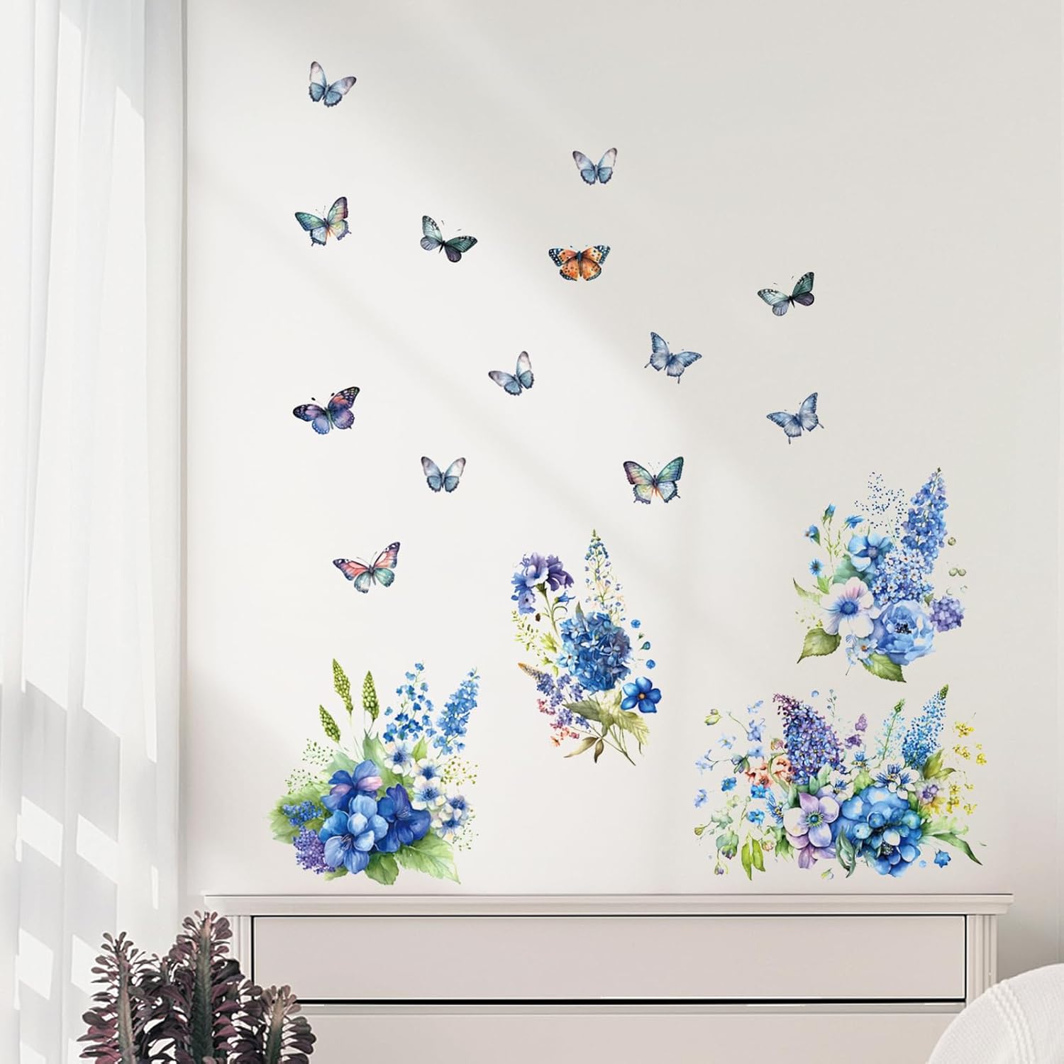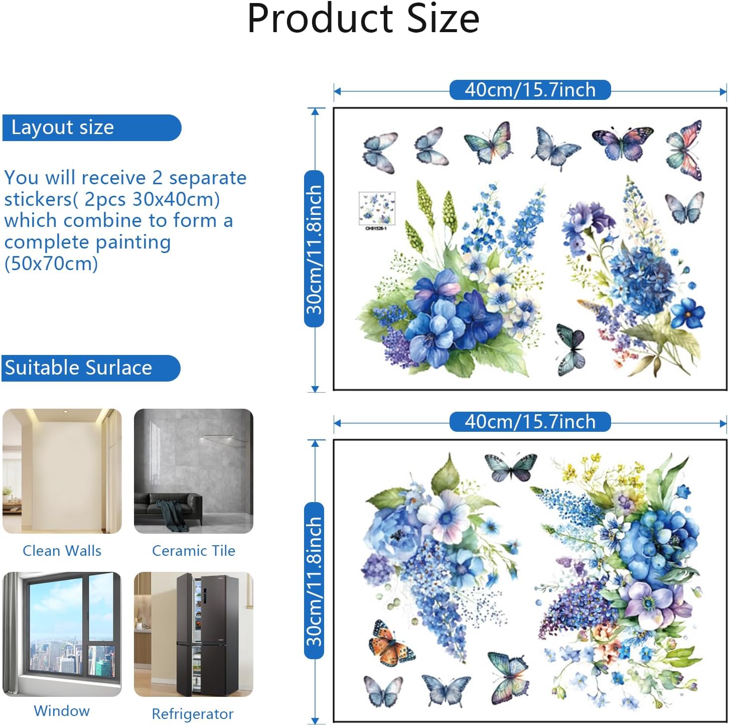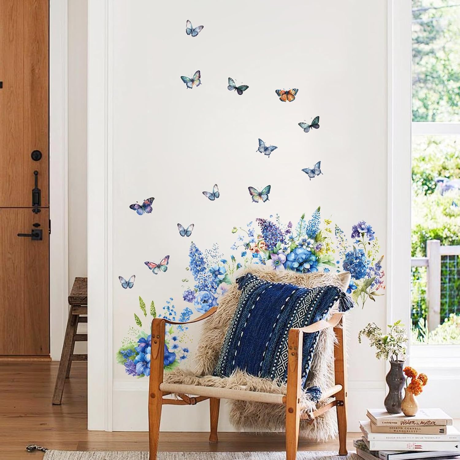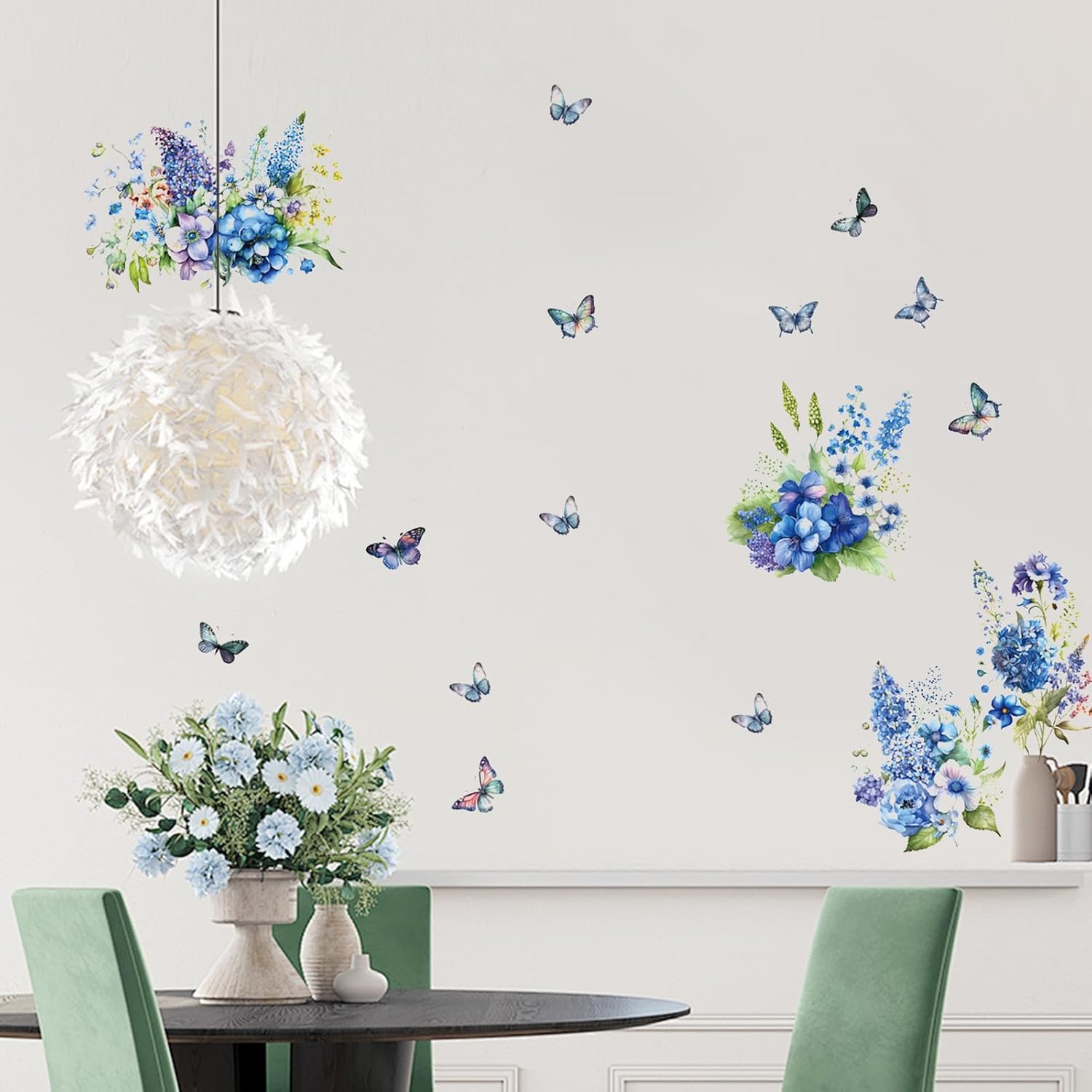 Wprowadź do swojego wnętrza elegancję i lekkość z tym zestawem samoprzylepnych naklejek z delikatnymi motylami i romantycznymi bukietami niebieskich kwiatów. Ten wzór przywodzi na myśl akwarelowy obraz i stworzy relaksującą atmosferę w każdym pomieszczeniu – od salonu po sypialnię.
