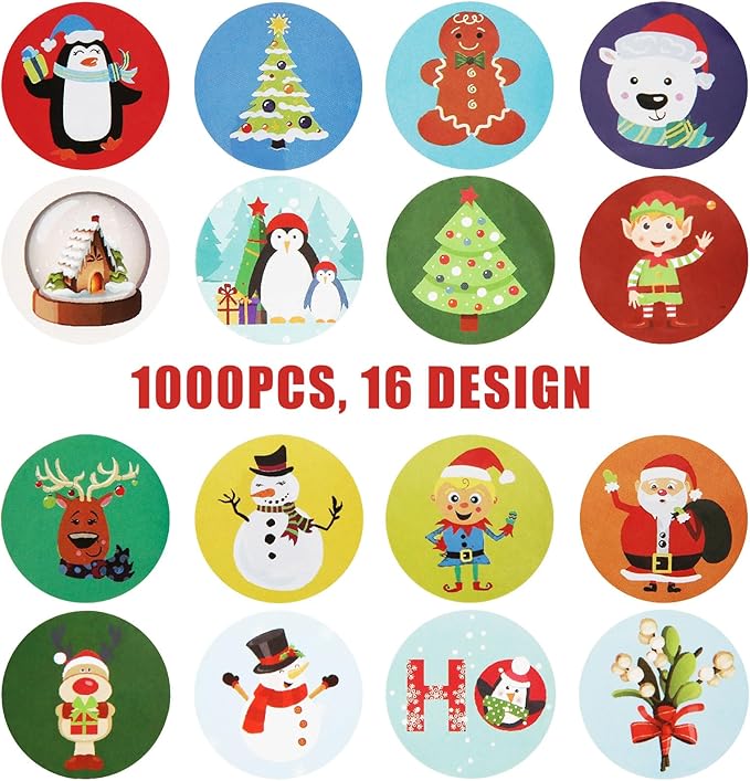 Każda naklejka ma średnicę 3,8 cm i zawiera jedną z 16 bożonarodzeniowych grafik, m.in.: